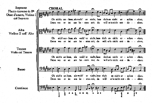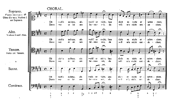 Ex. #12a. J. S. Bach: chorale "Ob sich's anliess, als wollt' er nicht." This illustration was produced by the Toppan ScanNote system and appeared in the Directory of Computer Assisted Research in Musicology 3 (1987), 35.