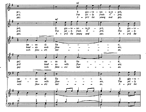 Ex. #13. Five-voice madrigal with text translation. This illustration was produced by Leland Smith using SCORE and appeared in the Directory of Computer Assisted Research in Musicology 4 (1988), 87.
