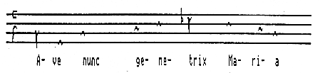 The presentation of neumes varied regionally and of course it varied over time. In Ex. #29 the incipit of "Ave nunc genetrix Maria" from the Handschrift Engelberg 314 (f. 98r) in the Stiftsbibliothek of St. Gall, Switzerland, we see a different style of neumatic notation. Its purpose is to serve as an incipit for cataloguing purposes.