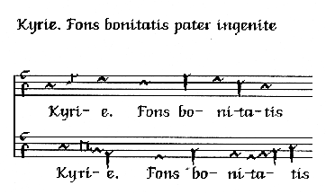 In Ex. #27 we see conventional chant notation as it is used today in liturgical books such as the Liber Usualis. The four-line staff is typical. This example includes (in order of their occurrence) the following types of neumes: a virga, three (later one more) puncta, two (later two more) podati, a clivis, an epiphonus, a cephalicus, a torculus, a porrectus, and, at the end, a punctum with a custos (the custos is a guide to the first pitch on the ensuing staff).